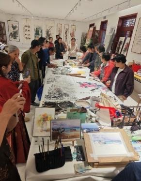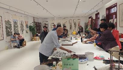 长辛店国潮街区国庆佳节再添文艺新景。10 月 3 日,由长辛店街道党工委、办事处主办,长辛店老友会承办的以“笔墨长辛,先锋印记”为主题的文化雅集活动,在国潮街区【吉福公社】拉开帷幕。画家张春萍作为此次活动的发起人,汇集长辛店老友会画家等十余位艺术家,以墨会友,通过传统书画创作与现代艺术互动相结合的方式,为国庆假期的市民带来一场沉浸式文化体验。长新店街道党工委、办事处领导;吉福公社主理人白芳妃;长辛店老友会艺术顾问张春萍,画家王国樑、张喜来、苏慧茹、龚震宇、㕁会国,书法家马程、陈锡福;北京市画家李长贵、王华、杜建斌、池占海等十余位艺术家出席了雅集开幕仪式,这场活动既是对传统文人雅集形式的当代延续,也是长辛店历史文化街区活化利用的生动实践。